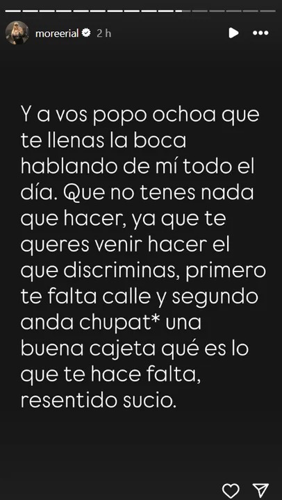 “Y a vos popo ochoa que te llenas la boca hablando de mí todo el día. Que no tenés nada que hacer, ya que te querés venir hacer el que discriminas, primero te falta calle y segundo anda chupat* una buena cajeta qué es lo que te hace falta, resentido sucio”, apuntó contra el panelista de LAM.