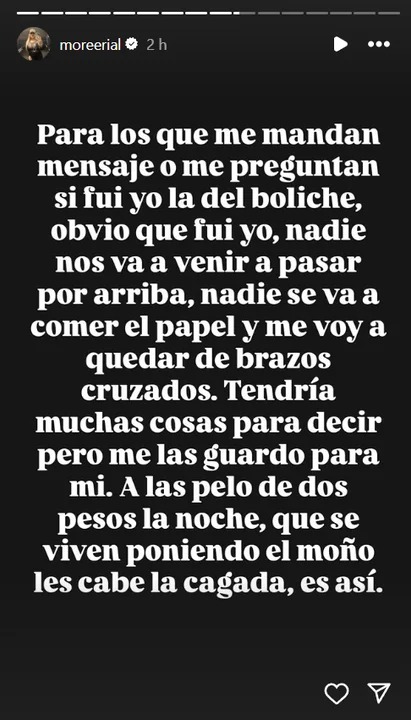 “Para los que me mandan mensaje o me preguntan si fui yo la del boliche, obvio que fui yo, nadie nos va a venir a pasar por arriba, nadie se va a comer el papel y me voy a quedar de brazos cruzados. Tendría muchas cosas para decir, pero me las guardo para mí. A las pelo de dos pesos la noche, que se viven poniendo el moño les cabe la cagada, es así”, escribió.