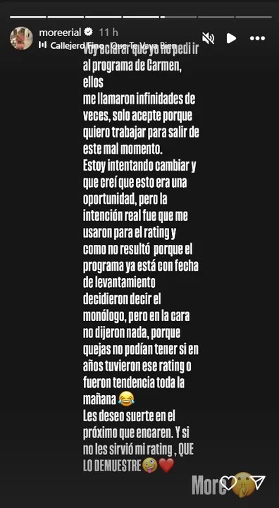 “Voy a aclarar que yo no pedí ir al programa de Carmen, ellos me llamaron infinidades de veces, solo acepte porque quiero trabajar para salir de este mal momento”, comenzó.