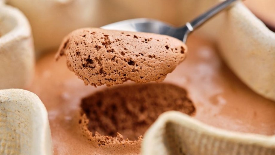 Cuando la mezcla caliente se enfría sobre un baño de hielo y se bate al mismo tiempo, las moléculas de grasa se solidifican parcialmente. El movimiento hace lo suyo para formar el postre: introduce aire en la mezcla. Así es como la grasa y los sólidos del cacao atrapan las burbujas de aire y se obtiene una emulsión estable y espumosa.