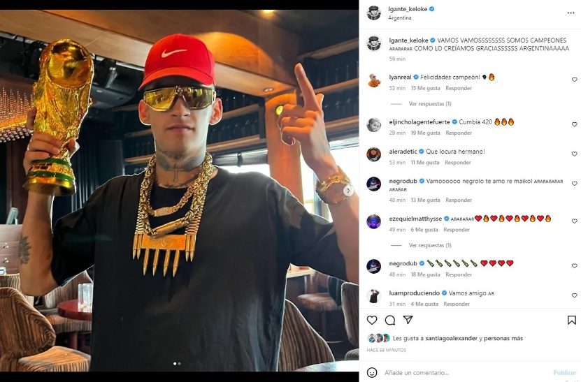 En tanto, el referente de la cumbia L-Gante miró el partido acompañado por familiares y amigos. Tras el triunfo del seleccionado, el músico compartió una foto levantando una réplica de la copa y escribió: “Vamos, vamos, somos campeones, como lo creíamos. Gracias, Argentina”.