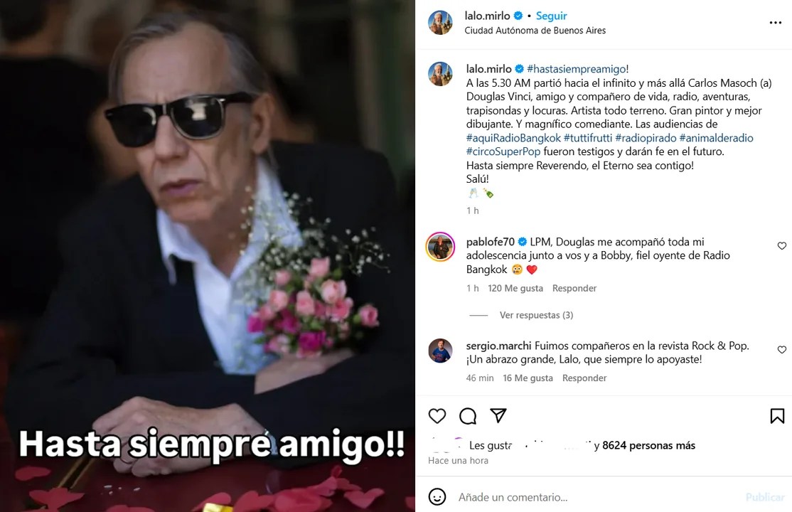 «A las 5:20 partió hacia el infinito y más allá Carlos Masoch (Douglas Vinci), amigo y compañero de vida, radio, aventuras, trapisondas y locuras. Artista todo terreno. Gran pintor y mejor dibujante. Y magnífico comediante», expresó Lalo Mir en sus redes.