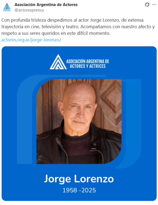 “Con profunda tristeza despedimos al actor Jorge Lorenzo, de extensa trayectoria en cine, televisión y teatro. Acompañamos con nuestro afecto y respeto a sus seres queridos en este difícil momento”, informaron en la cuenta oficial de X.
