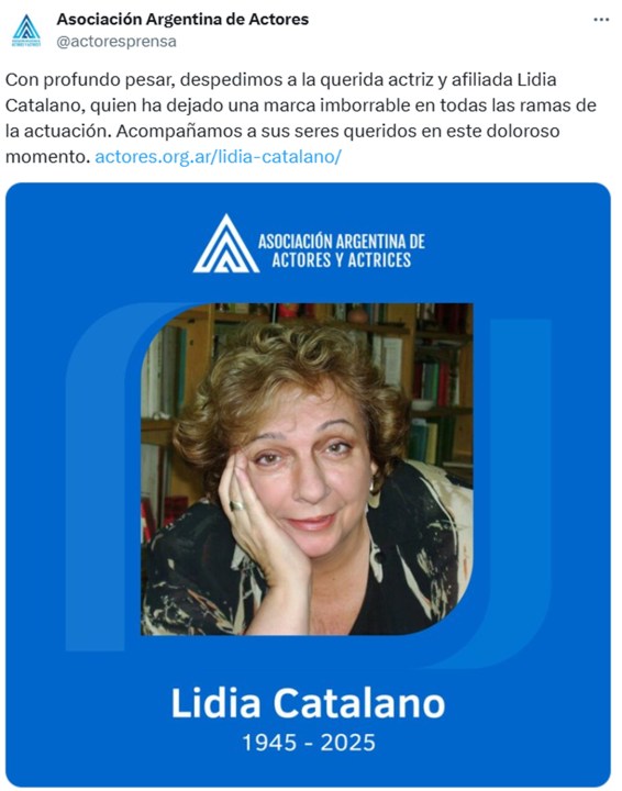 El mundo del espectáculo despidió con tristeza este domingo a la actriz Lidia Catalano, de 79 años, una artista que dedicó su vida a la actuación y marcó una época en cada escenario que pisó.