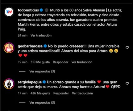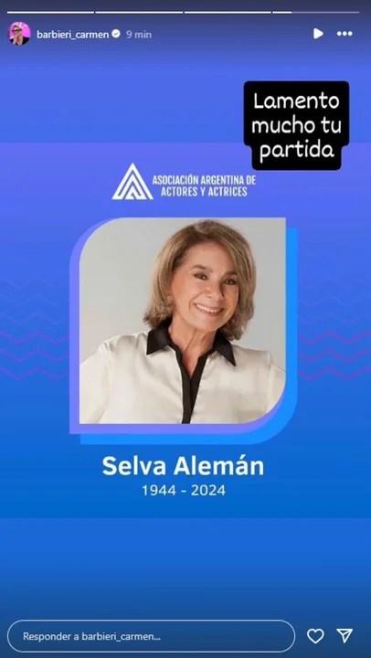 Carmen Barbieri compartió el comunicado de la Asociación de Actores argentinos en sus historias de Instagram y escribió: “Lamento mucho tu partida”. Por otra parte, la actriz Nancy Duplaá utilizó el mismo método y se limitó a poner un emoji triste.