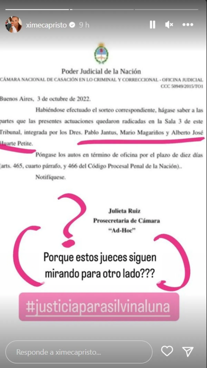 «Por qué estos jueces siguen mirando para otro lado? #JusticiaparaSilvinaLuna», pidió Ximena Capristo.