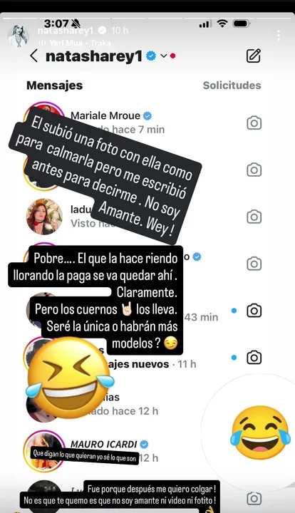 A ello, Natasha publicó una captura de su casilla de mensajes de Instagram, señalando que previo al romántico posteo de Icardi a la China, él se habría comunicado con ella: “Él subió una foto con ella como para calmarla pero me escribió antes para decirme. No soy amante, wey”.