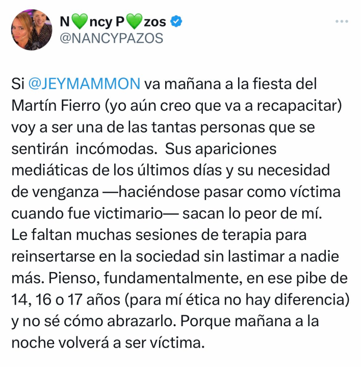 “Si Jey Mammon va a la fiesta del Martín Fierro (yo aún creo que va a recapacitar) voy a ser una de las tantas personas que se sentirán incómodas”, inició.