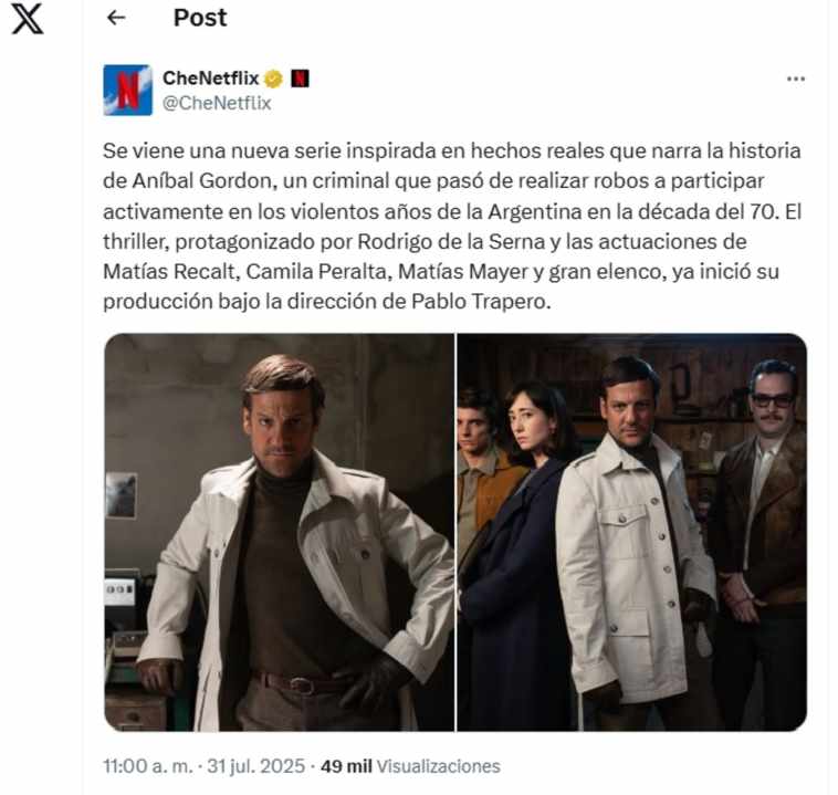 En un adelanto de la su nueva producción, acompañada de las primeras imágenes de la serie, Netflix anunció en sus redes sociales: «Se viene una nueva serie inspirada en hechos reales que narra la historia de Aníbal Gordon, un criminal que pasó de realizar robos a participar activamente en los violentos años de la Argentina en la década del 70. El thriller, protagonizado por Rodrigo de la Serna y las actuaciones de Matías Recalt, Camila Peralta, Matías Mayer y gran elenco, ya inició su producción bajo la dirección de Pablo Trapero»