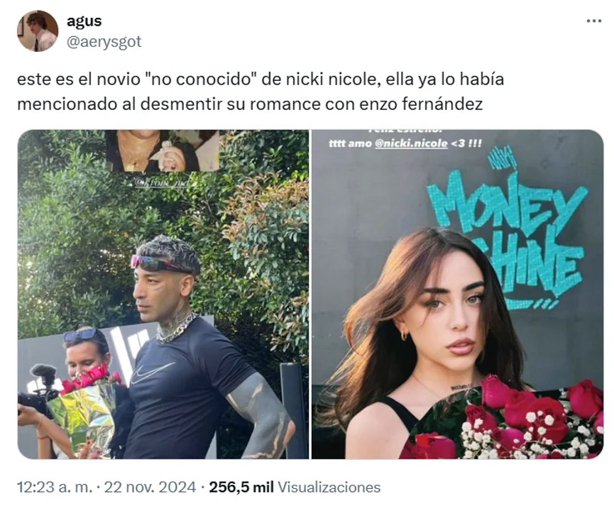 En la imagen que compartió la usuaria, Nicki posa junto a las flores que le habría regalado su “verdadera pareja” por el lanzamiento de su último álbum. Ambos artistas pertenecen al mismo grupo de amigos y se los ha visto en las mismas fotos, pero nunca posando juntos.