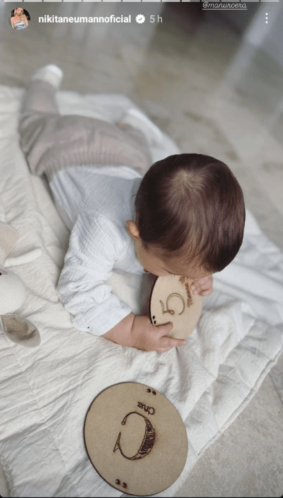A través de su Instagram Stories, Neumann compartió algunas de estas postales donde el bebé posa junto a un muñeco. Con unos círculos realizados en fibro fácil que tienen inscripto «C» y «5 meses», el pequeño se fotografió sin dejar ver su rostro.