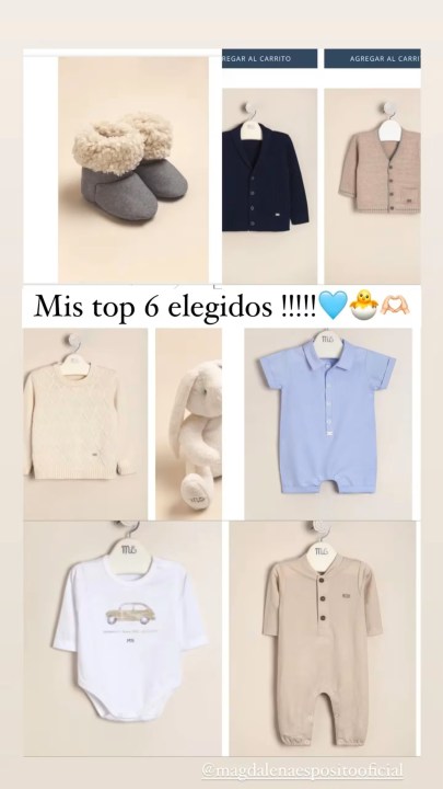 “Mis top 6 elegidos”, escribió en un posteo que compartió en sus historias de Instagram, donde se puede apreciar varios modelos de outfits y peluches que escogió para el bebé.