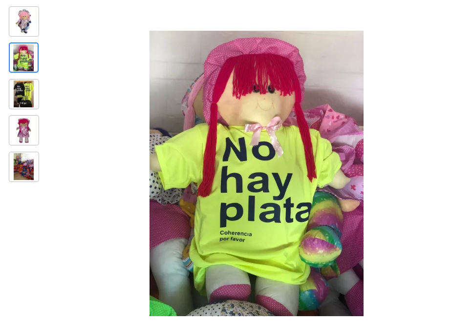 Uno de los sitios donde se pueden encontrar es en Mercado Libre. Incluso hay promociones. Se ofrece una muñeca y una remera con esa cita, a 12.600 pesos. Hay diferentes colores para elegir.