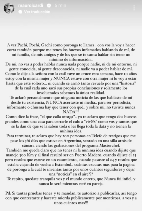 “Te aclaro que hay 200 personas en Telefe de testigos que me pasé los 5/6 días que estuve en Argentina, sentando en una silla detrás de cámara viendo las grabaciones del programa MasterChef. También me queda claro que no tenés la más mínima idea cuando dijiste que manejé 300 km. Y al final resultó ser Puerto Madero, cuando dijiste el 23, pero resulta que estuve en un casamiento. Cuando pasaste al 24 y resulta que estaba viajando a Estambul. ¿Cuántas excusas más para la página de poron… a la cual te inventás tanto por unos cuántos seguidores y dejar una ‘noticia’ en el aire? Te repito, quedate tranquila vos y el mundo entero, que nunca fui infiel y nunca lo seré mientras esté en pareja», señaló Icardi en su descargo.