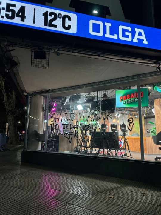 Este viernes 13 de junio, el canal de streaming OLGA amaneció con pintadas apoyando a Cristina Fernández y advirtiendo a dos influencers, que participan de un programa.