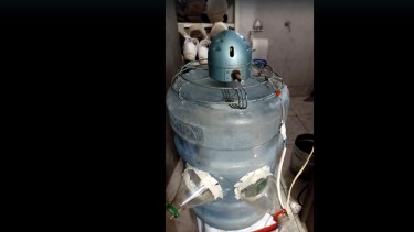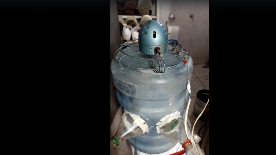 Después de investigar, el siguiente paso fue mirar a su alrededor: un ventilador chico, un bidón de agua y algunas botellas vacías resultaron ser los elementos que necesitaba para su «máquina». Como nada se desaprovecha, hasta usó el hielo que quedó cuando descongeló su heladera para la parte de adentro.