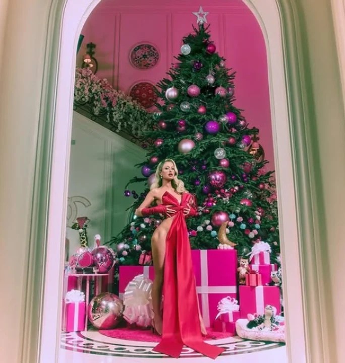 Para la producción, la rubia usó varios looks en ropa interior y eligió el particular del moño rojo para pararse delante de los regalos navideños. De fondo se podía ver el logo de la marca Chanel, una de las elegidas por la millonaria para armar sus looks.
