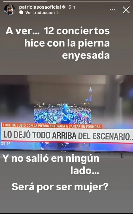 “A ver… 12 conciertos hice con la pierna enyesada. Y no salió en ningún lado…”, escribió en sus historias de Instagram. “¿Será por ser mujer?”, cuestionó.