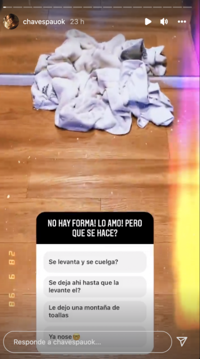 La conductora se filmó sentada en su vestidor, resignada, junto a los toallones mojados que Pedro había dejado tirados tras bañarse y expresó: «No hay forma, lo amo… ¿Pero qué se hace? Necesito ayuda, no sé qué hacer. Es todos los días de mi vida… Todos los días de mi vida encuentro la toalla acá…«.