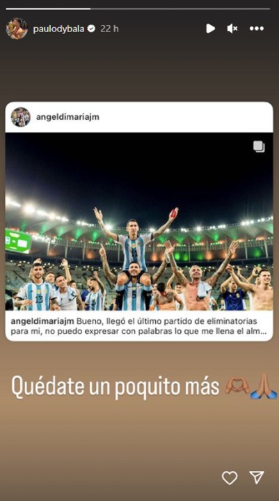 Paulo Dybala continuó metido en los temas de la Selección Argentina y despidió a Ángel di María, el delantero que ayer anunció que dejará al equipo que dirige Lionel Scaloni. «Quedate un poquito más» puso el jugador, con un emoji de manos de rezo, junto a una foto de su par.