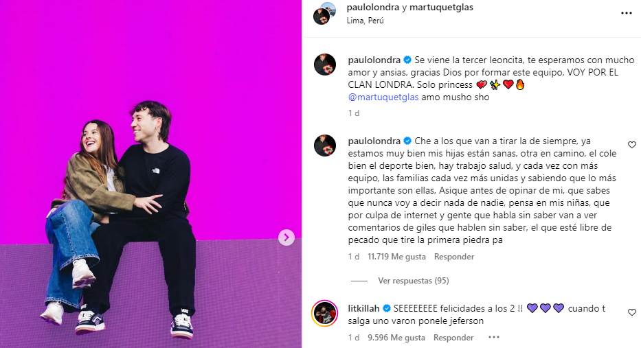 “Se viene la tercera leoncita, te esperamos con mucho amor y ansias. Gracias Dios por formar este equipo, voy por el clan Londra. Solo princess. @martuquetglas te amo mucho”, escribió el artista en su cuenta de Instagram, acompañando el posteo con tiernas fotos junto a Martina.
