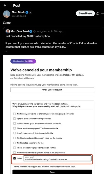 «Acabo de cancelar mi suscripción a Netflix. Si empleas a alguien que celebró el asesinato de Charlie Kirk y crea contenido que promueve contenido pro-trans entre mis hijos… Nuna recibirás ni un centavo de mi dinero. Es tan simple como eso», escribió Van Swol y Musk respondió: «Lo mismo».