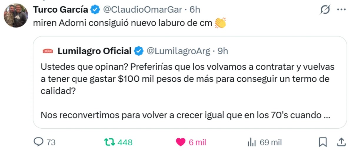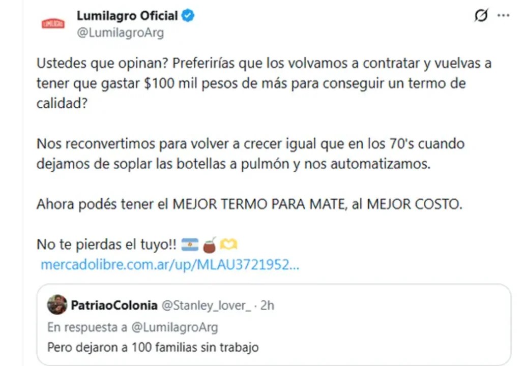 Todo comenzó cuando, desde su cuenta oficial, recomendaron comprar termos de la marca Stanley. A partir de allí, la cuenta de Lumilagro —que es manejada por su propio dueño— publicó un mensaje que generó una ola de críticas.