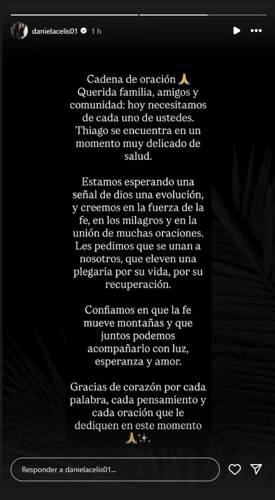 “Cadena de oración. Querida familia, amigos y comunidad: hoy necesitamos de cada uno de ustedes. Thiago se encuentra en un momento muy delicado de salud. Estamos esperando una señal de dios, una evolución, y creemos en la fuerza de la fe, en los milagros y en la unión de muchas oraciones. Les pedimos que se unan a nosotros, que eleven una plegaria por su vida, por su recuperación”, imploró.