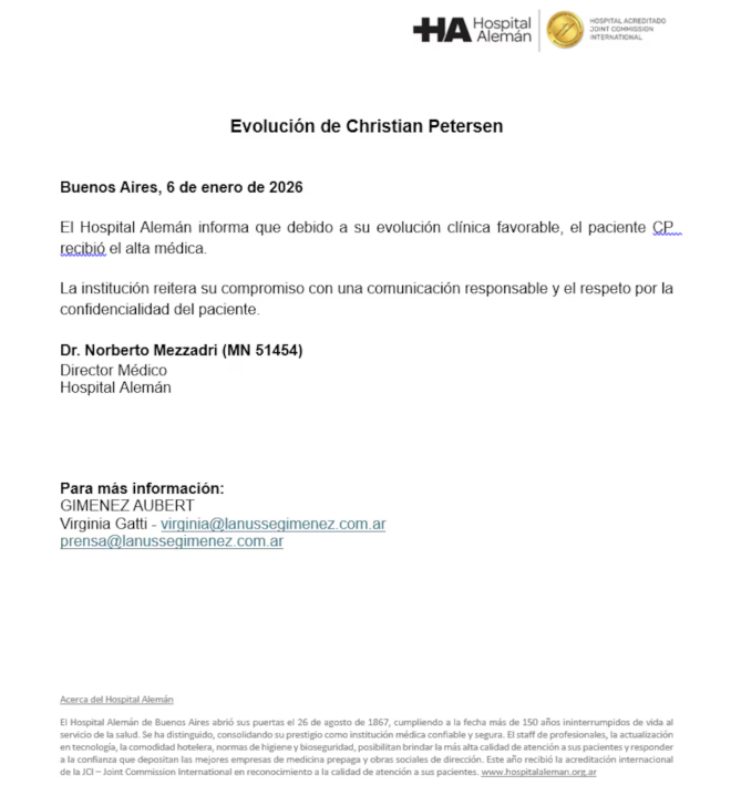 El Hospital Alemán de Buenos Aires difundió este martes 6 de enero el último parte médico sobre el estado de salud de Christian Petersen, en el que brindó precisiones sobre su evolución clínica y el alta.