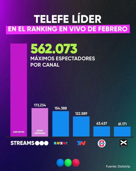 Telefe Deportes contabilizó más de 562 mil espectadores y Gran Hermano superó los 173 mil. El podio lo completó Luzu TV con más de 154 mil espectadores.