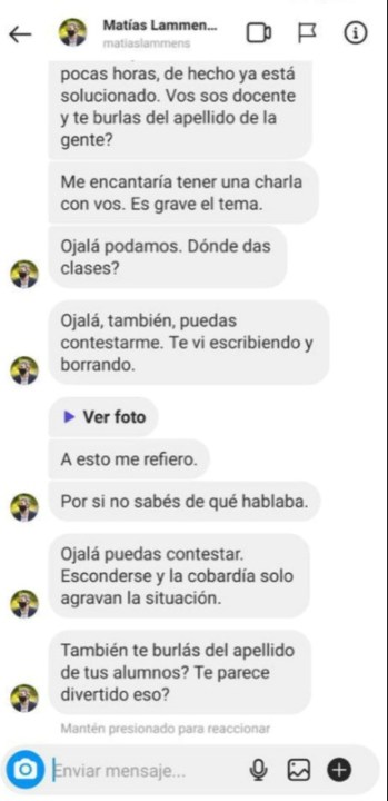 «Ojalá puedas contestar. Esconderse y la cobardía solo agrava la situación. También te burlás del apellido de tus alumnos? Te parece divertido eso?», le reprochó Lammens a Vedani.