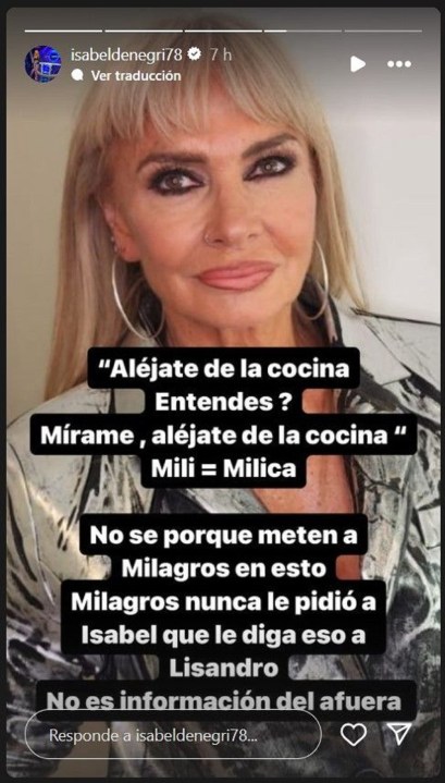“No sé por qué meten a Milagros en esto. Milagros nunca le pidió a Isabel que le diga eso a Lisandro. No es información del afuera” publicaron en la cuenta personal de Instagram de la participante de Gran Hermano.