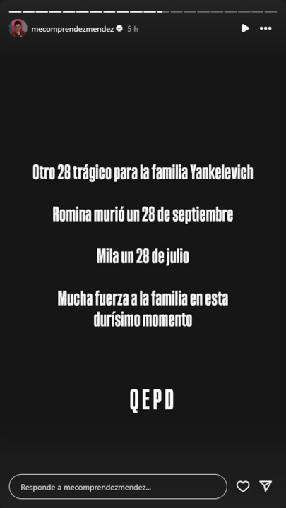 Fue el periodista Gustavo Méndez quien remarcó en una de sus historias de Instagram la casualidad entre ambos sucesos con una reflexión: “Otro 28 trágico para la familia Yankelevich. Romina murió un 28 de septiembre. Mila un 28 de julio. Mucha fuerza a la familia en este durísimo momento. QEPD”.