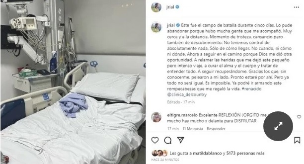 «Este fue el campo de batalla durante cinco días. Lo pude abandonar porque hubo mucha gente que me acompañó. Muy cerca y a la distancia», escribió el periodista en su cuenta de Instagram debajo de una foto donde se ve la cama vacía de la clínica Del Country de Bogotá.