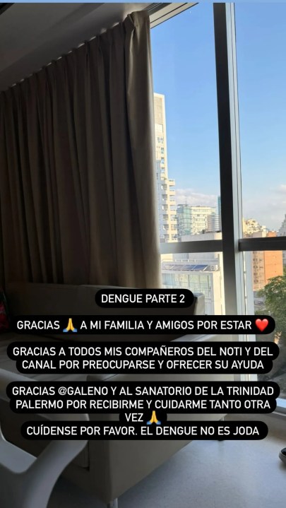 A través de sus historias de Instagram, la conductora se mostró desde el hospital y escribió: «Dengue parte 2. Gracias a mi familia y amigos por estar. Gracias a todos mis compañeros del noti y del canal por preocuparse y ofrecer su ayuda».