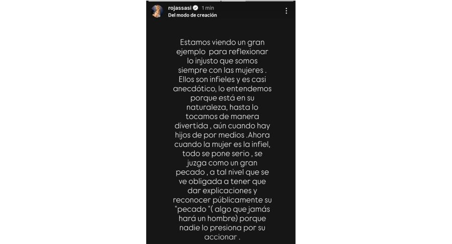 «Ellos son infieles y es casi anecdótico, lo entendemos porque está en su naturaleza, hasta lo tocamos de manera divertida, aún cuando hay hijos de por medios. Ahora cuando la mujer es la infiel, todo se pone serio, se juzga como un gran pecado, a tal nivel que se ve obligada a tener que dar explicaciones y reconocer públicamente su ‘pecado’ (algo que jamás hará un hombre) porque nadie lo presiona por su accionar», concluyó completamente molesta.