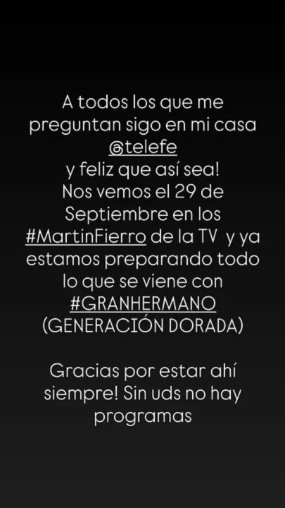 El conductor indicó en qué evento estará presente: «Nos vemos el 29 de Septiembre en los Martín Fierro de la TV» y cerró su comunicado contando los avances del reality show: «Ya estamos preparando todo lo que se viene con Gran Hermano (Generación Dorada)«.