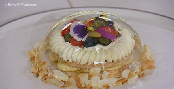 Para la prueba técnica los jurados eligieron desafiar a los jugadores con un postre francés: un da cquoise bajo un domo de caramelo.