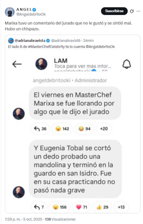 “El viernes en MasterChef Marixa (Balli) se fue llorando por algo que le dijo el jurado”, informó Ángel de Brito en sus redes sociales. Y agregó: “Y Eugenia Tobal se cortó un dedo probando una mandolina y terminó en la guardia en San Isidro. Fue en su casa practicando. No pasó nada grave”.