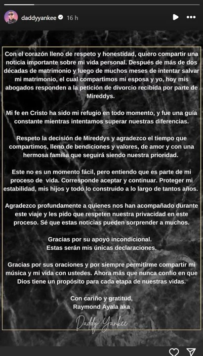 “Con el corazón lleno de respeto y honestidad, quiero compartir una noticia importante sobre mi vida personal. Después de más de dos décadas de matrimonio y luego de muchos meses de intentar salvar mi matrimonio, el cual compartimos mi esposa y yo, hoy mis abogados responden a la petición de divorcio recibida por parte de Mireddys”, comenzó el posteo que compartió en sus historias de Instagram.
