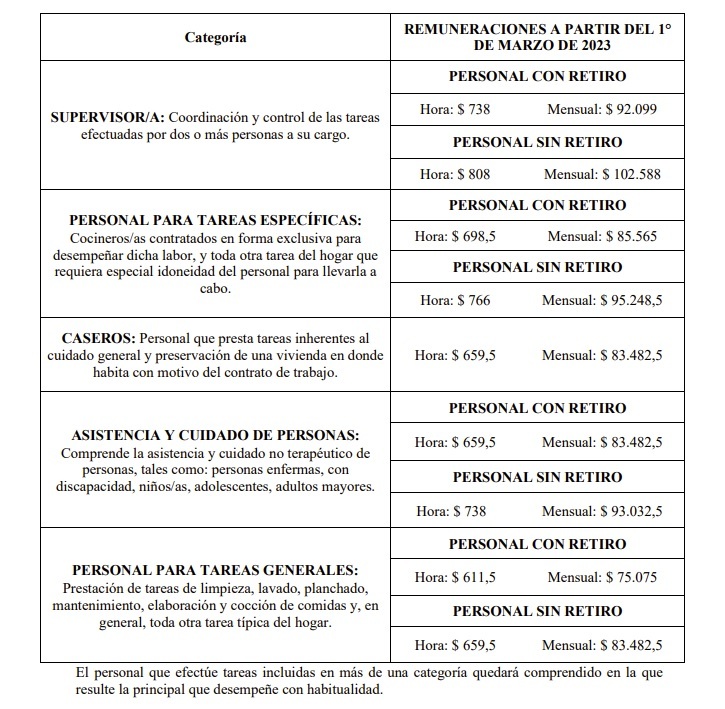 Con todos los porcentajes percibidos, la denominada «quinta categoría» o de tareas generales, que es la más numerosa, cobrará en marzo 611,32 pesos por hora y 75.074,56 pesos mensuales (en ambos casos, personal con retiro) y $659,06 por hora y $83.482,38 mensuales (sin retiro).