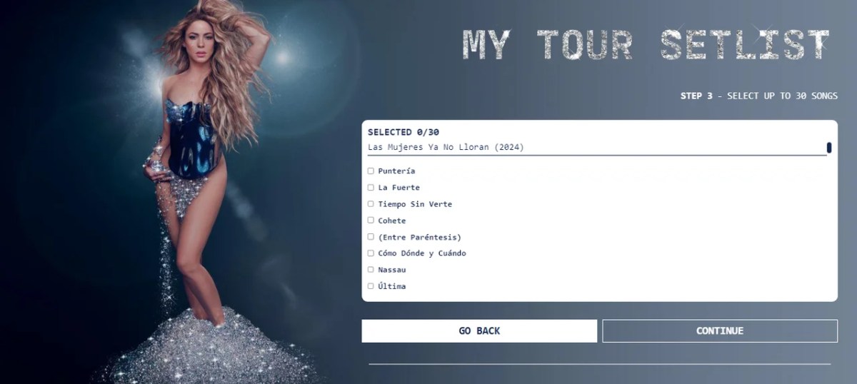 La playlist se puede seleccionar en la página oficial de Shakira y una vez ingresado en la sección “create” resta completar nombre y email, para poder elegir las 30 canciones a votación. Se podrán elegir temas de toda su discografía, que abarca desde Pies Descalzos en 1995, hasta Las mujeres ya no lloran en 2024.