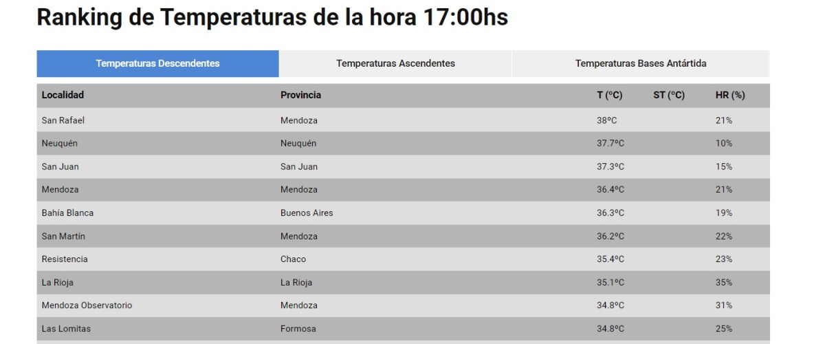 Neuquén es a las 17.30 la segunda ciudad más calurosa del país, con 37,7 grados, según el ranking de temperaturas que difunde el Servicio Meteorológico Nacional.