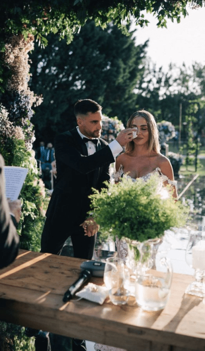 Luego del casamiento se viralizaron dos imágenes: la primera lo muestra al futbolista asistiendo a su pareja con un pañuelo y despertó la ternura de todo Twitter Argentina; la segunda imagen que circulo fue una de él sentado frente a la cámara en lo que parece ser la previa del casamiento luciendo un traje impecable.