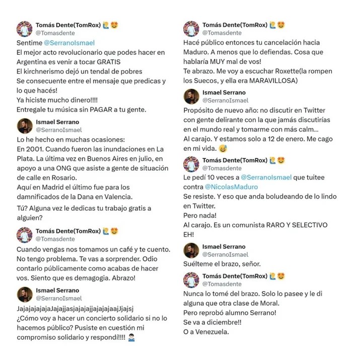 Serrano le respondió: «Lo he hecho en muchas ocasiones: en 2001. Cuando fueron las inundaciones en La Plata. La última vez en Buenos Aires en julio, en apoyo a una ONG que asiste a gente de situación de calle en Rosario. Aquí en Madrid el último fue para los damnificados de la Dana en Valencia. ¿Tú? ¿Alguna vez le dedicas tu trabajo gratis a alguien?».