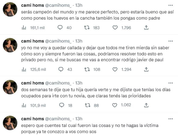 «Mucha cara linda pero el machito asqueroso y mujeriego que sos no te lo saca nadie. Dos semanas te dije que tu hija quería verte y me dijiste que tenías los días ocupados para irte con tu novia, que claras tenés las prioridades. Yo no me voy a quedar callada y dejar que todos me tiren mierd… sin saber cómo son y siempre fueron las cosas, podríamos resolver todo esto en privado pero no, si me buscas me vas a encontrar Rodrigo Javier De Paul», exponen otros tuits.