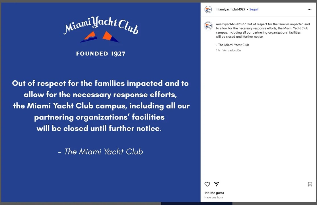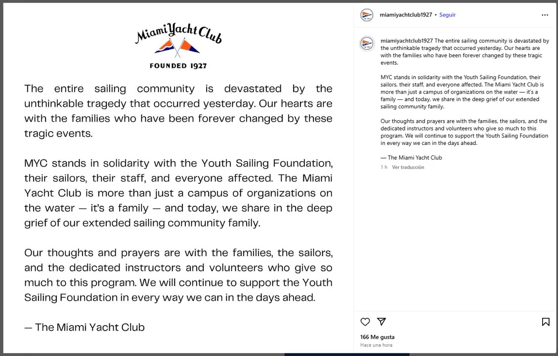El Miami Yacht Club se solidarizó con la fundación de vela juvenil, sus marineros y su personal. «El Miami Yacht Club es más que un simple campus de organizaciones en el agua, es una familia, y hoy compartimos el profundo dolor de nuestra extensa familia de la comunidad de la vela», agrega el comunicado.