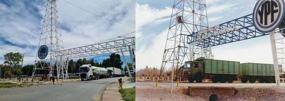 Otro de los cambios realizados en más de cinco décadas, tiene que ver con la ubicación del cartel de la petrolera YPF, en en la época en la que Miguel fue retratado, estaba en una esquina del arco y hoy se luce sobre la vieja torre que representa el legado de la actividad hidrocarburífera que carga Huincul.
