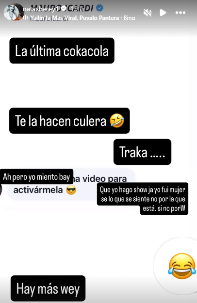 En un primer clip que subió a sus redes, Natasha se grabó a sí misma mientras viajaba en auto y de fondo se escuchaba el tema “Con Otra”, de Cazzu. Y, sobre esta secuencia, escribió: “Si fue así con ella… También lo será contigo”.