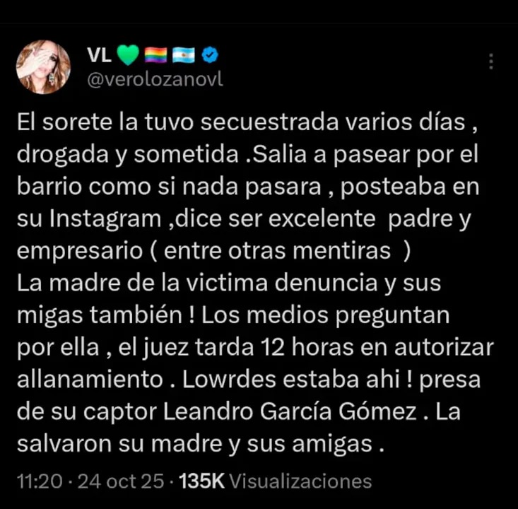 “La madre de la víctima denuncia y sus amigas también. Los medios preguntan por ella, el juez tarda 12 horas en autorizar el allanamiento. Lourdes estaba ahí, presa de su captor Leandro García Gómez. La salvaron su madre y sus amigas”, concluyó en el posteo.